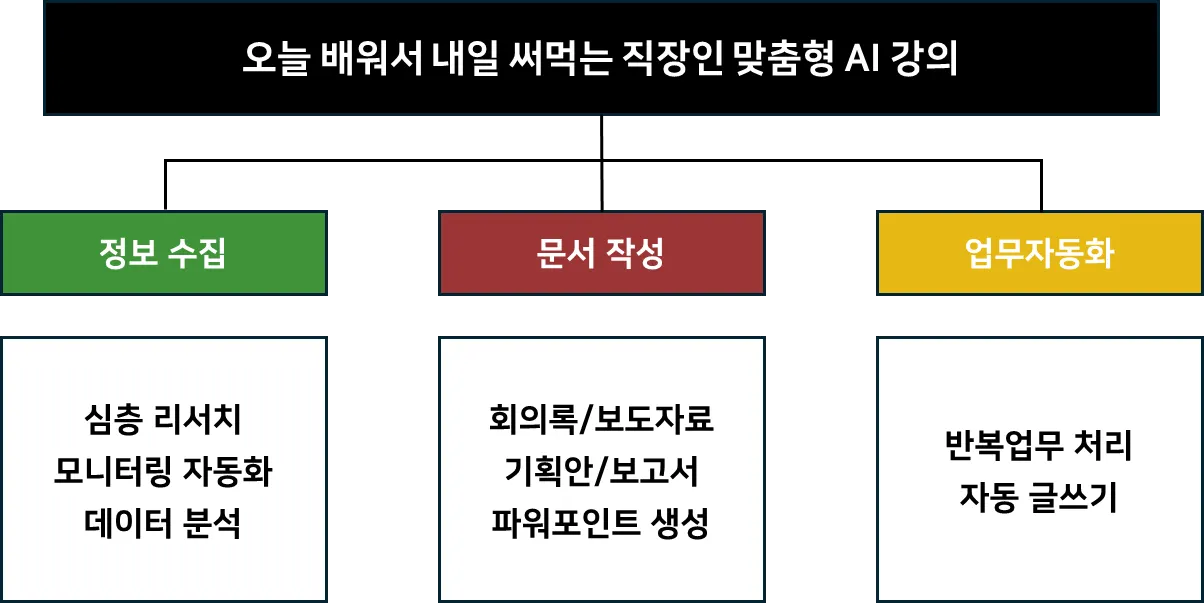 이 과정을 통해 정보 수집 및 가공, 각종 문서 작성, 반복 업무 자동화 등의